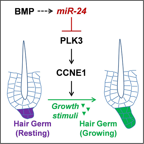 研究人员发现,在毛囊由静止到激活转变过程中,即将激活的毛囊前体细胞显著下调了一个miRNA,miR-24。通过构建和分析miR-24的皮肤上皮特异性诱导过表达和条件性敲除小鼠模型,研究人员发现miR-24的作用是限制毛囊前体细胞对生长刺激的敏感性。miR-24在皮肤上皮组织中的过表达显著延缓了毛囊前体细胞的激活与毛发周期推进,而它在皮肤上皮组织中的条件性敲除显著加速了毛发周期,并提高了毛囊对毛发再生刺激的敏感性。值得一提的是,miR-24的皮肤条件性敲除能够显著提高米诺地尔(minoxidil)生发水的生发效果,且无可见副作用,提示miR-24具有作为新型生发治疗靶点的潜力。从机制上讲,研究人员发现Plk3是一个新的miR-24的靶基因,它通过调控参与细胞周期的关键蛋白CCNE1在miR-24的激活限制功能中发挥主要作用。此外,研究人员还发现,miR-24作用于已知的毛发生长抑制信号BMP的下游。