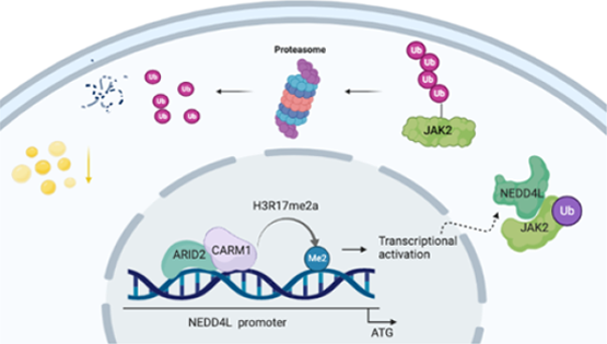 该研究发现,Arid2肝脏特异性敲除的小鼠在正常饮食下7个月时会自发产生肝脏脂肪变性,高脂饮食则会加剧这一进程。研究人员进一步探索了其中的机理并揭示ARID2通过负调控JAK2-STAT5-PPARγ影响了肝脏脂质代谢。机制研究发现,ARID2通过上调E3连接酶NEDD4L的转录从而促进JAK2的泛素化。ARID2招募CARM1到NEDD4L的启动子区域,增加该区域组蛋白H3第17位精氨酸的不对称双甲基化(H3R17me2a)从而促进其转录。此外,在Arid2肝脏特异性敲除的小鼠中,JAK2的抑制剂Fedratinib能够有效的缓解高脂饮食诱导的肝脏脂肪变性。在商业购得的NAFLD病人的肝脏样本中,研究人员检测到了较低的ARID2蛋白水平并且验证了ARID2与JAK2的负相关性。综上所述,该研究揭示了ARID2在维护肝脏脂质稳态中的重要作用,并为ARID2缺失的NAFLD患者提供了有效的治疗策略参考。
