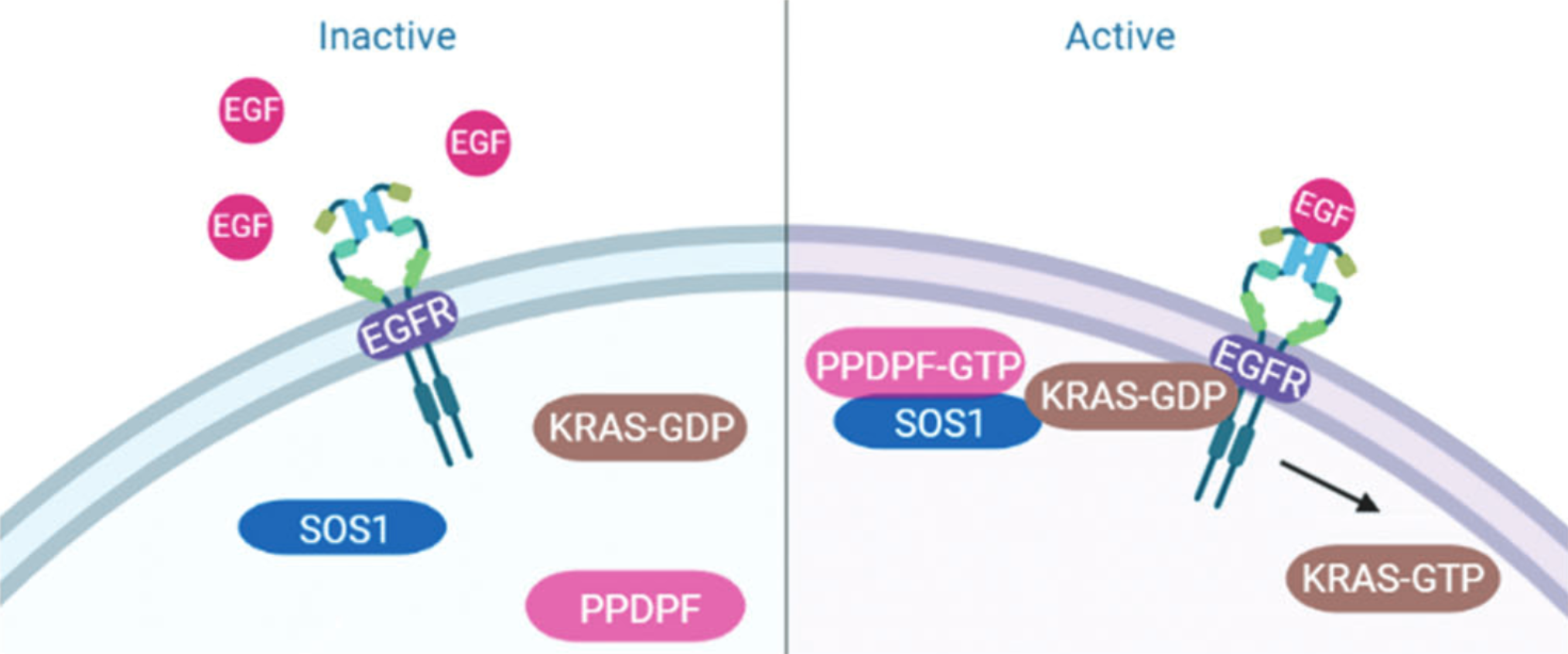 本研究发现PPDPF在胰腺癌中的表达显著升高,PPDPF高表达的患者预后较差。在胰腺导管腺癌小鼠模型中敲除Ppdpf显著抑制Kras突变驱动的PDAC的发生发展。此外,研究人员还证明了PPDPF可以结合GTP,并将GTP提供给SOS1,从而增强其GEF活性,促进KRAS的活化。该项研究揭示了PPDPF在PDAC中的新功能和KRAS活化调控的新机制,为PDAC提供了一个潜在的治疗靶点。