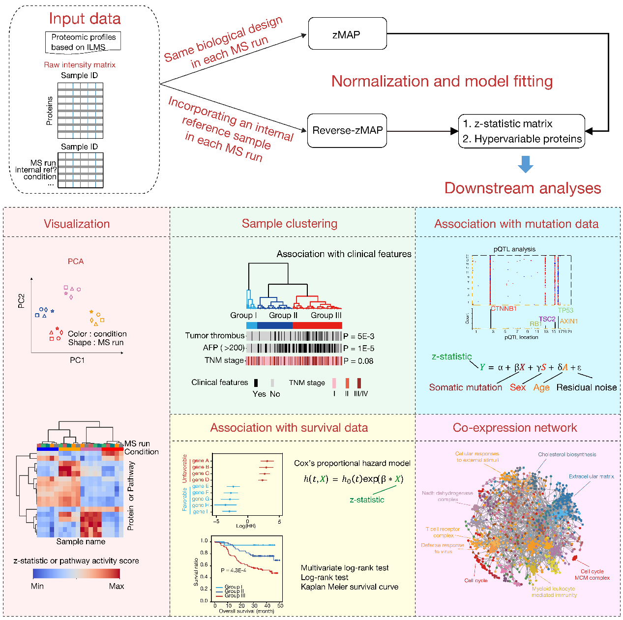 TMT和iTRAQ等重同位素标记技术已广泛用于蛋白质组定量分析,为研究组织发育和疾病进程中的蛋白质表达变化提供了基础。现有的蛋白质组差异分析工具主要面向两个或两组样本之间比较,能进行多样本比较的工具有限。尤其是这些平台生成的蛋白质组数据往往包含强烈的批次效应,导致能够整合多个质谱实验批次数据开展定量比较分析的工具更是匮乏,局限了它们在大规模生物样本分析中的应用。针对该瓶颈,研究者开发了zMAP和reverse-zMAP两个新计算模型,并基于它们搭建了一个多功能的蛋白质组数据分析平台,面向基于不同实验设计的多批次多样本数据开展统计比较和下游整合分析(图1)。