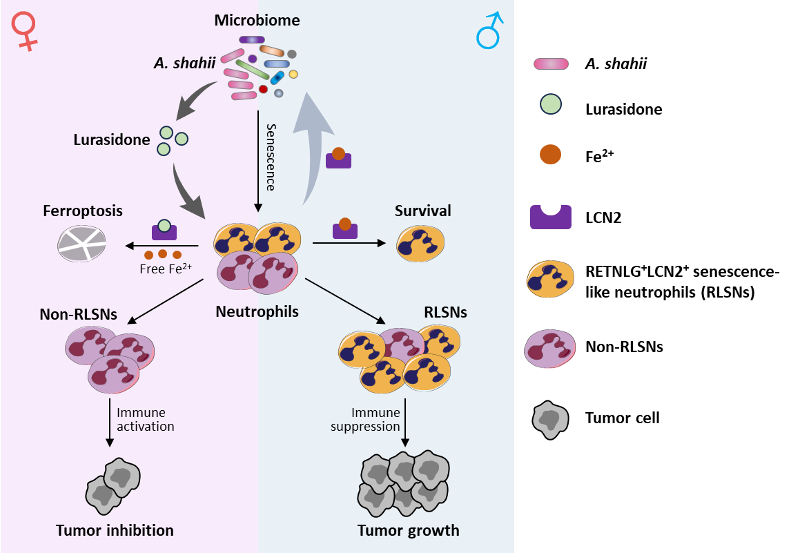 基于先前研究提示中性粒细胞衰老由肠道微生物群调节,研究团队进一步发现雌性小鼠肠道中一种名为Alistipes shahii的肠道菌(以下简称A. shahii)显著增多,且该菌相关的代谢产物鲁拉西酮的水平在雌性小鼠中更高。鲁拉西酮可直接靶向RLSNs中的标志性蛋白——LCN2,由于LCN2是一种铁螯合蛋白,由此释放细胞内Fe²⁺并促进RLSNs的铁死亡,最终清除了雌性肿瘤中富集的RLSNs。而雄性因缺乏A. shahii及鲁拉西酮,导致RLSNs的铁死亡被抑制,并大量积累在雄性肿瘤微环境中以抑制抗肿瘤免疫。此外,雄性体内积累的RLSNs会分泌大量LCN2蛋白以清除对铁敏感的A. shahii,进一步抑制了体内A. shahii的含量。