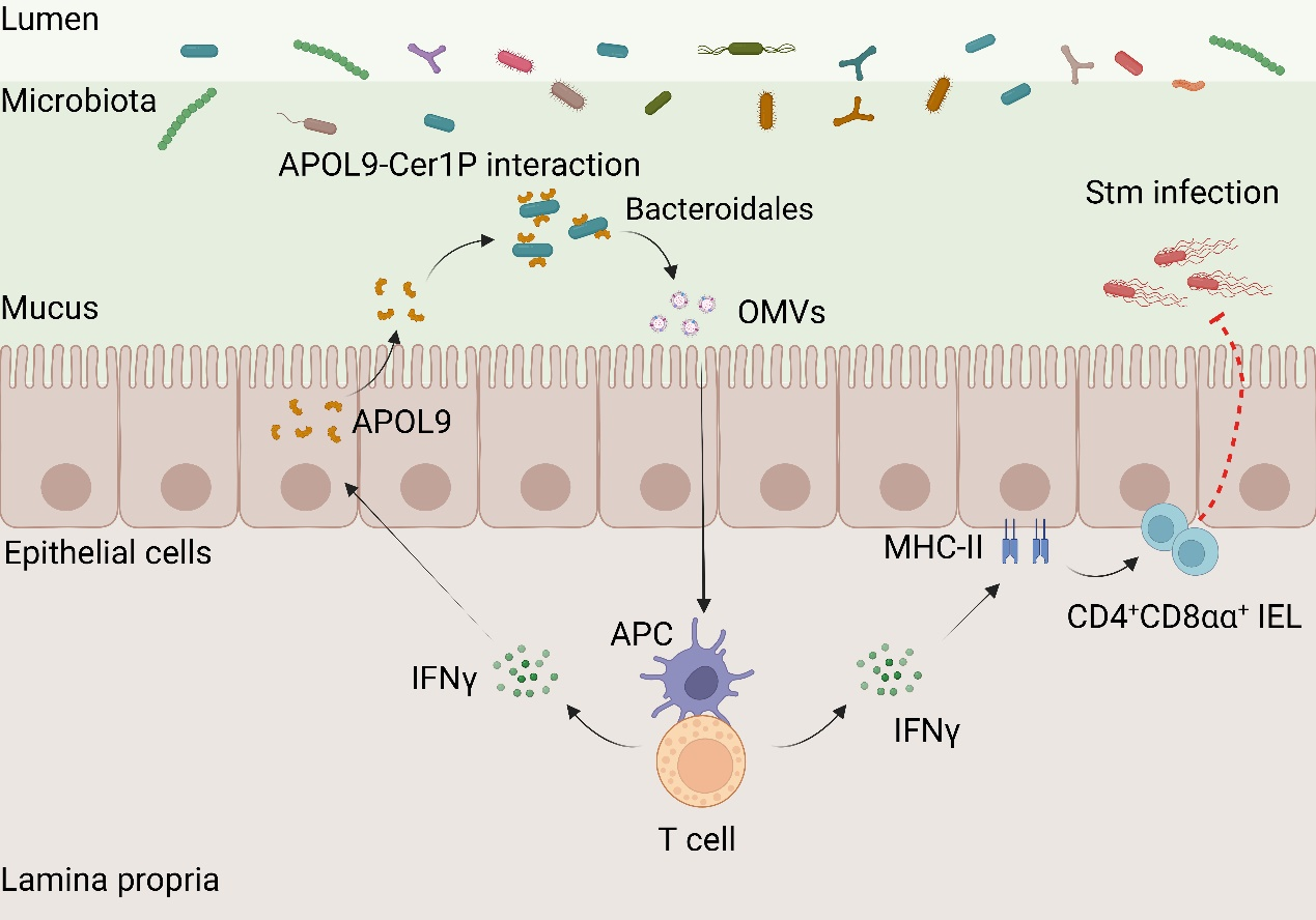 图:新型载脂蛋白APOL9通过结合拟杆菌Cer1P分子诱导OMVs释放并激活IFN-γ-MHC-II通路以增强肠道黏膜免疫
