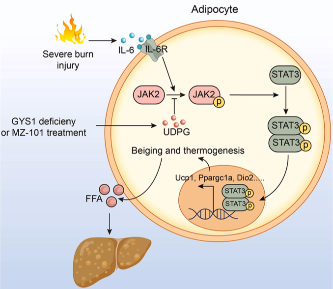 研究团队发现在烧伤后,小鼠与人类白色脂肪组织中的GYS1表达均显著上调。脂肪组织特异性Gys1基因敲除能够有效抑制烧伤引发的白色脂肪组织褐变及脂解过程,改善肝脏脂肪变性并显著提高生存率。值得注意的是,Gys1敲除并未影响棕色脂肪组织的正常产热功能,也未缓解肌肉组织的消耗现象。在分子机制上,研究人员发现Gys1缺失会促使UDPG在细胞内大量积累,这些积聚的UDPG通过不依赖β3-肾上腺素能或P2Y14受体通路的独特方式,有效抑制了IL-6诱导的JAK2-STAT3信号通路的激活。通过分子对接与表面等离子共振实验,研究团队证实了UDPG与JAK2蛋白之间存在直接的特异性结合。更重要的是,研究人员采用特异性GYS1小分子抑制剂MZ-101进行烧伤治疗,可成功模拟基因敲除的效果,显著提升脂肪组织内UDPG水平,重现包括抑制白色脂肪组织褐变、改善肝脏脂肪变性在内的多种表型改善效果,并最终显著提高烧伤实验动物的生存率。