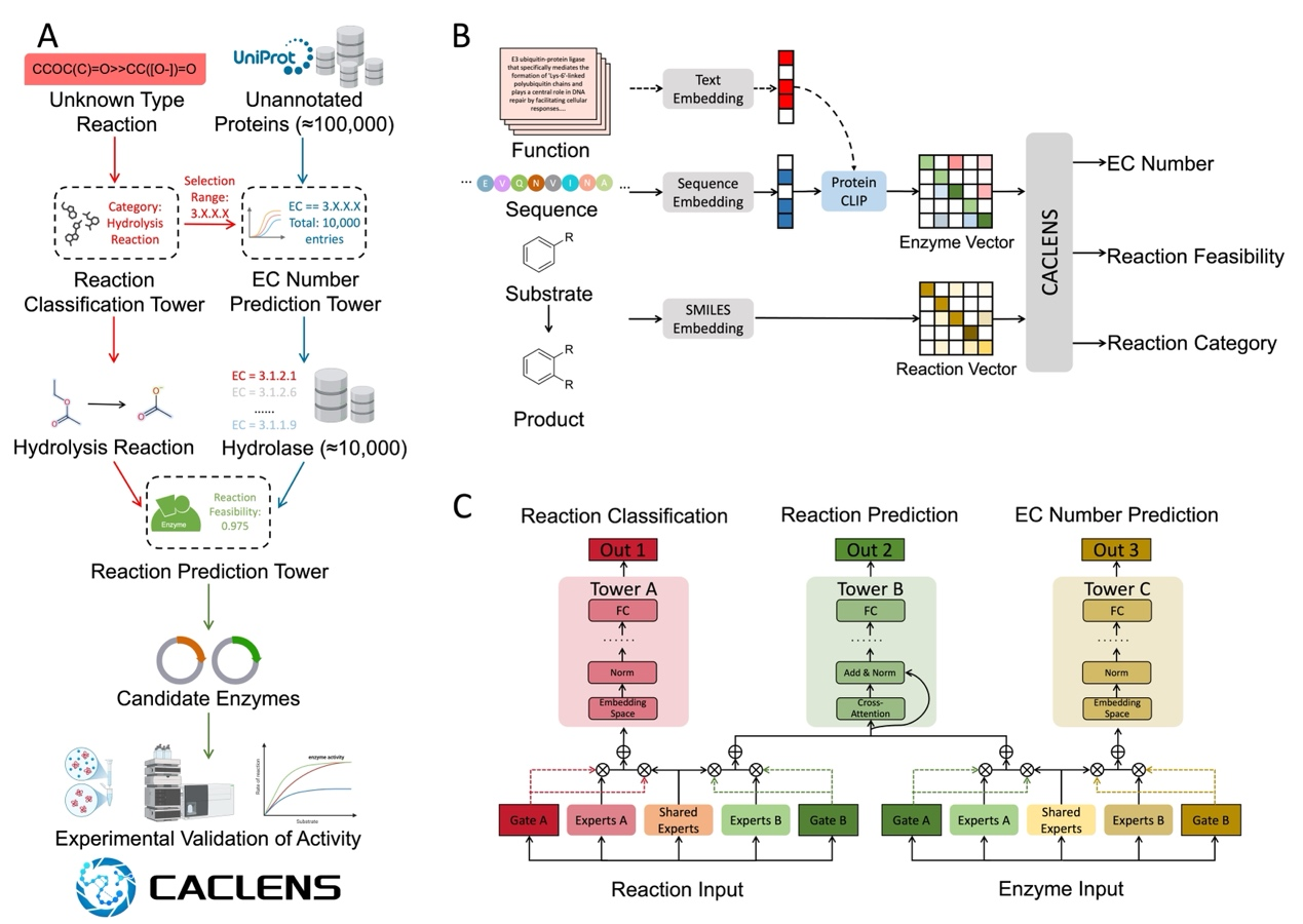 近年来,深度学习在酶的结构、功能与性质的大规模预测领域取得了显著进展。然而,由于缺乏面向多模态输入和多任务输出的统一建模能力,现有方法仍难以满足高性能功能酶筛选的需求。针对这一挑战,研究团队设计并开发了CACLENS (Cross-Attention & Contrastive Learning-enabled Enzyme Selection)框架,将CGC(Customized Gate Control)门控机制、对比学习与交叉注意力等方法深度融合,构建出可同时执行多项预测任务的一体化酶筛选平台。