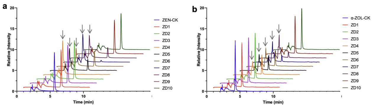 针对真菌毒素玉米赤霉烯酮(ZEN),研究团队以CACLENS的多任务联合预测结果为基础,从大规模序列空间中快速筛选出10个潜在降解酶候选体。随后,通过基因合成、异源表达与纯化获得相应酶蛋白,并对其降解性能开展系统实验验证。结果表明,约一半的候选酶具有对ZEN 的催化活性,其中ZD4与ZD7能够在体外体系中降解超过90%的ZEN。