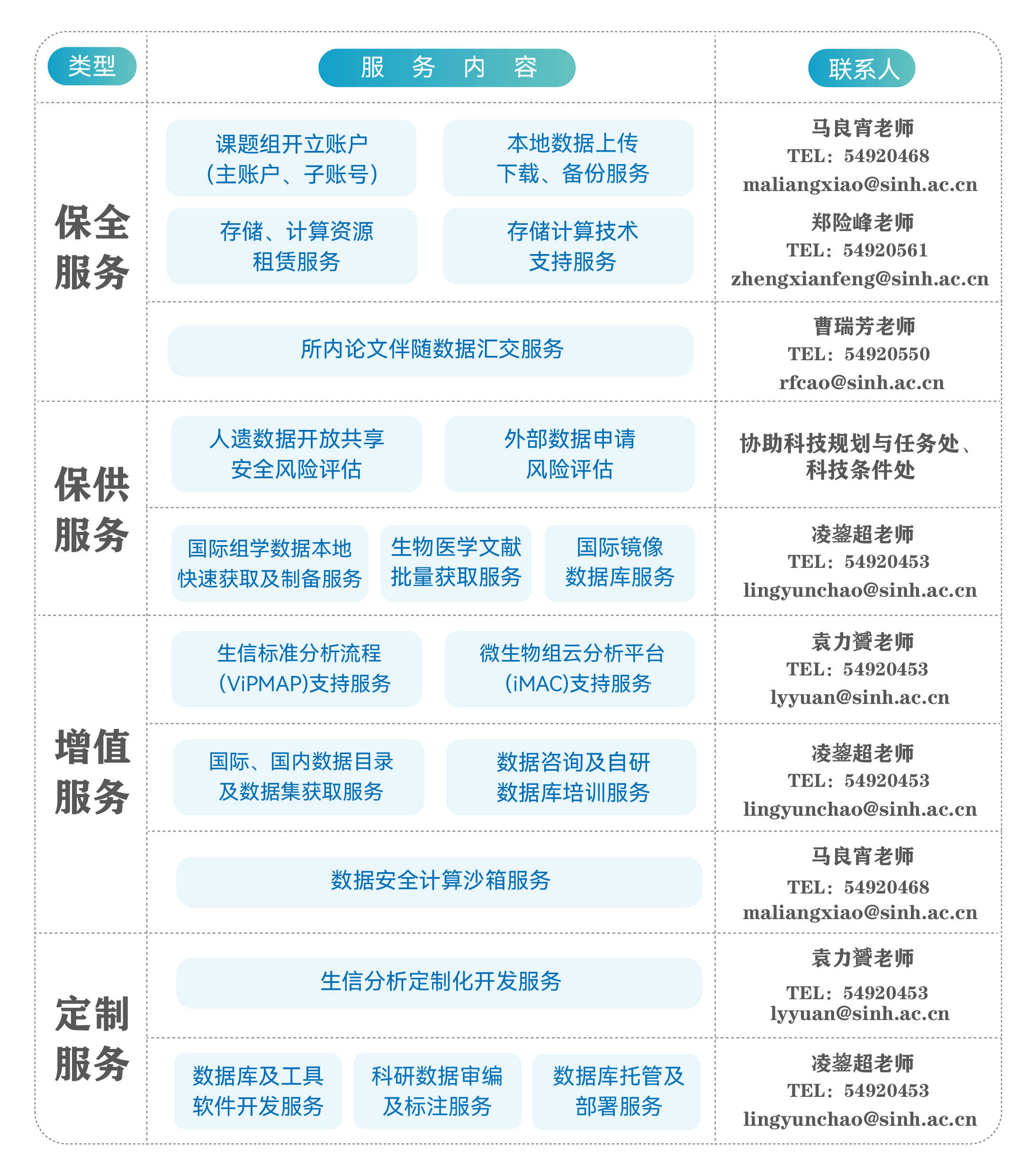 中国科学院上海营养与健康研究所所级科学数据中心成立于2023年6月,由生物医学大数据中心承建,致力于加强和规范研究所的科学数据管理,保障科学数据安全,提高科学数据开放共享水平。所级科学数据中心坚持契合中国科学院科学数据中心体系建设规范,面向所内提供科学数据“保全、保供、增值、定制”四类服务,包括科学数据安全保存与汇交,非公开数据的转移、获取与保存,科学数据目录与应用,基础数据分析以及高级定制数据分析与软件开发。