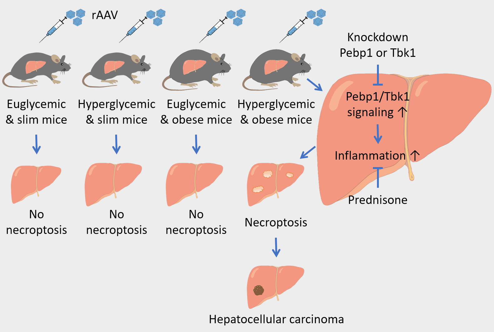 图:重组腺相关病毒(rAAV)注射导致肥胖的高血糖小鼠肝脏程序性坏死和肝癌发生。腺相关病毒注射后,肥胖的高血糖小鼠出现肝脏程序性坏死和肝癌,但正常小鼠、体重正常的高血糖小鼠或正常血糖的肥胖小鼠没有相应的现象。泼尼松龙(Prednisone)治疗或抑制Pebp1-Tbk1信号通路可有效抑制腺相关病毒的作用。