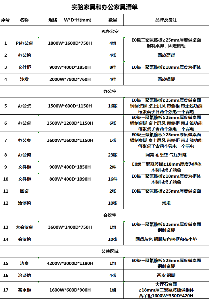 4、项目内容和要求:完成办公家具制作和安装,项目完成后达到建设单位使用要求、并符合相关现行制度及规范《GB18584-2001室内装饰装修材料木家具中有害物质限量》等;建议参选单位仔细现场踏勘。