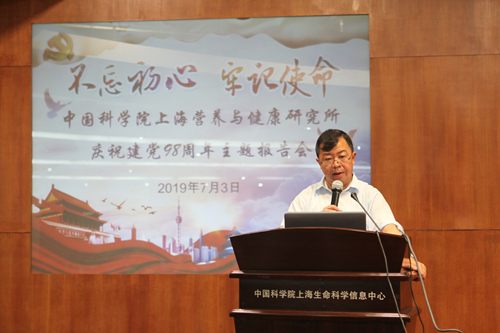 2019年7月3日上午,中科院上海营养与健康研究所组织召开纪念建党98周年暨“不忘初心,牢记使命”主题报告会,特邀中国科学院院士、上海市科技功臣奖获得者、原上海有机化学研究所所长林国强研究员为全体党员作《坚定创新自信,科技发展引领未来》的主题报告,营养与健康所领导班子及助理、两委委员、科研骨干、行政管理部门负责人等150余人参会了学习。党委书记蔡澎主持报告会。