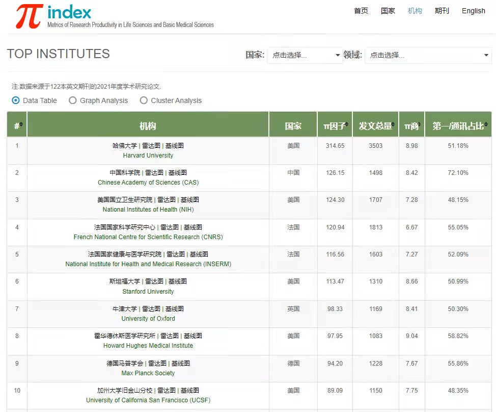 哈佛大学以π因子314.65(π商8.98)位居全球第一;中国科学院π因子为126.15(π商8.42)位居全球第二,中国科学院由2019年的全球第七升至2020年的全球第二,2021年继续保持第二位;洛克菲勒大学π商为10.65位居第一,中国医学科学院北京协和医学院2021年π商8.87,首次进入全球π商TOP10机构(基于π值TOP100机构比较得到)。