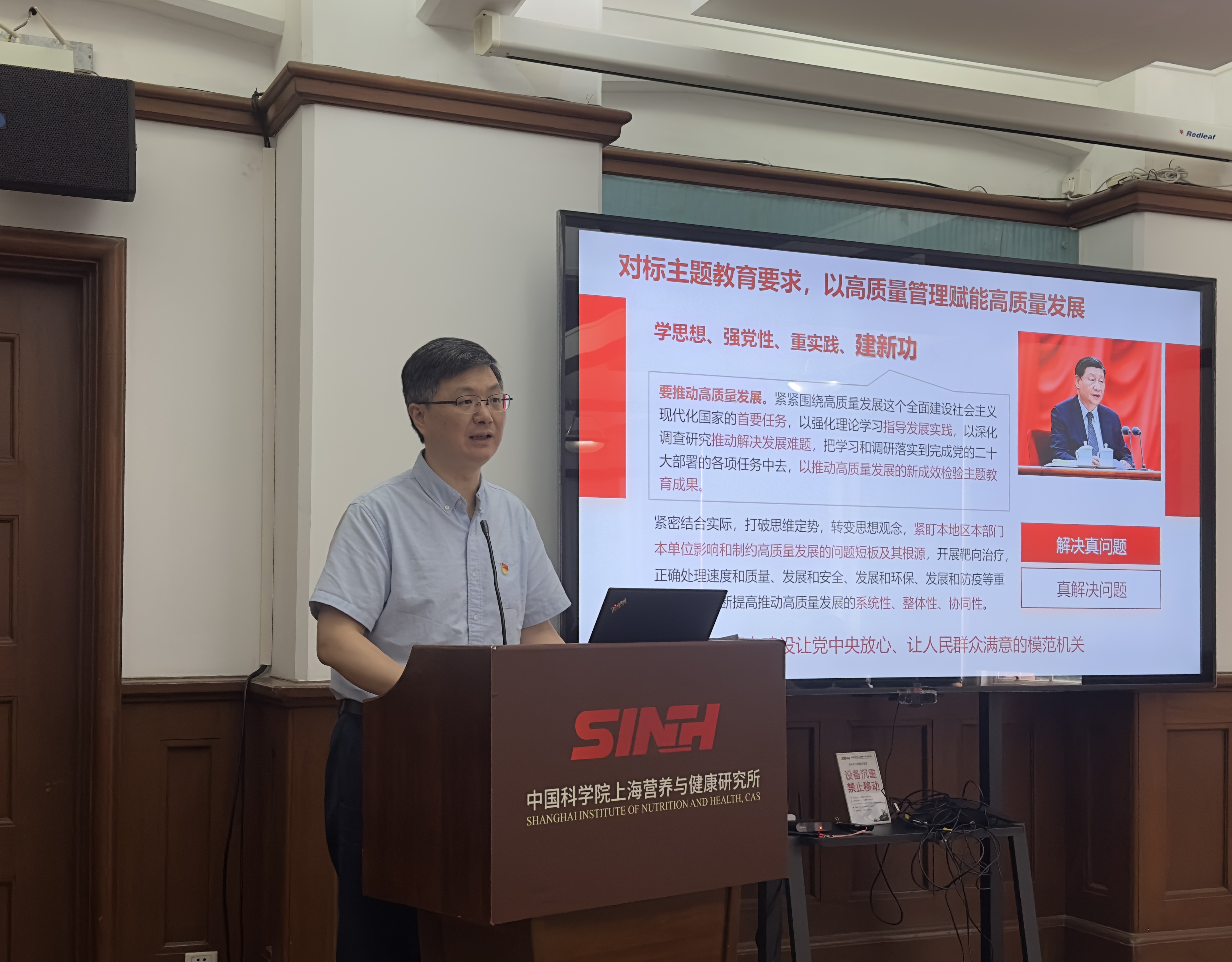 7月26日,中国科学院上海营养与健康研究所召开学习贯彻习近平新时代中国特色社会主义思想主题教育专题党课报告会,中国科学院上海分院副院长、分党组成员高召兵到会指导。所领导班子成员、两委委员、全体管理与支撑部门工作人员70余人参加了会议。会议由党委书记瞿荣辉主持。