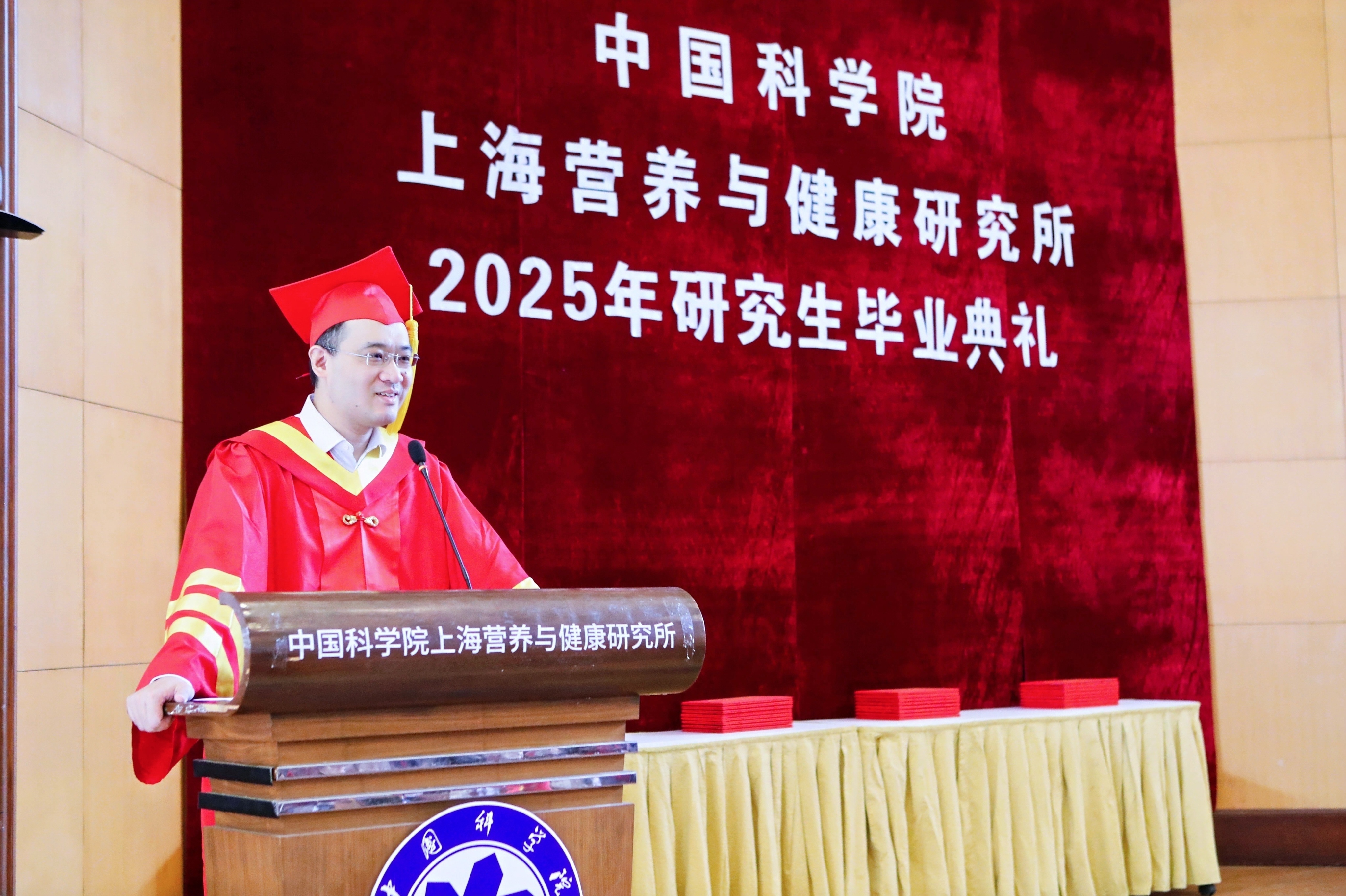 6月20日,中国科学院上海营养与健康研究所2025年研究生毕业典礼在生科大楼报告厅举行。营养与健康所所长、党委副书记汪思佳,副所长、学位评定委员会主席胡国宏,所务委员、学位评定委员会副主席邵振,学位评定委员会委员孔祥银、王跃祥,导师代表熊燕、黄涛、王振,2025届毕业生与毕业生亲友、研究生处教育管理干部等100余人齐聚一堂,共同参与了这一盛典。毕业典礼由邵振主持。