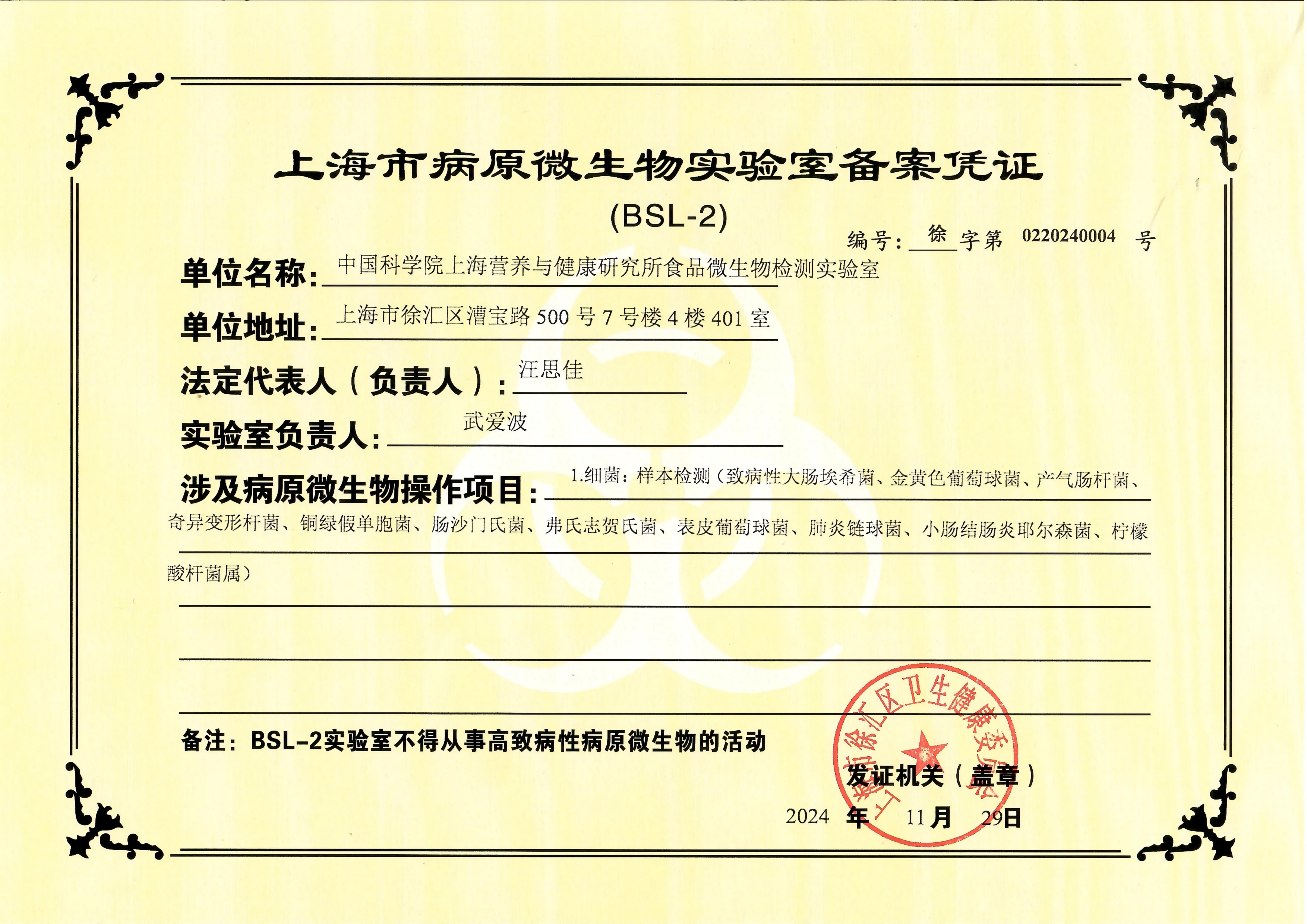 设有P2生物安全(食品)实验室微生物保藏室微生物培养室PCR实验室生化检验室及必要的配套设施及仪器。2025年6月获通过检验检测机构资质认定(CMA)。