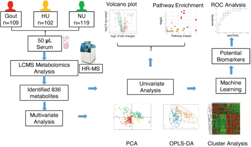 图1. TripleTOF 6600利用基于高分辨质谱的代谢组学技术与机器学习方法系统揭示了痛风和高尿酸血症中显著改变的代谢通路,成功筛选到了13种潜在的代谢物,用以区分无症状高尿酸血症和痛风患者。