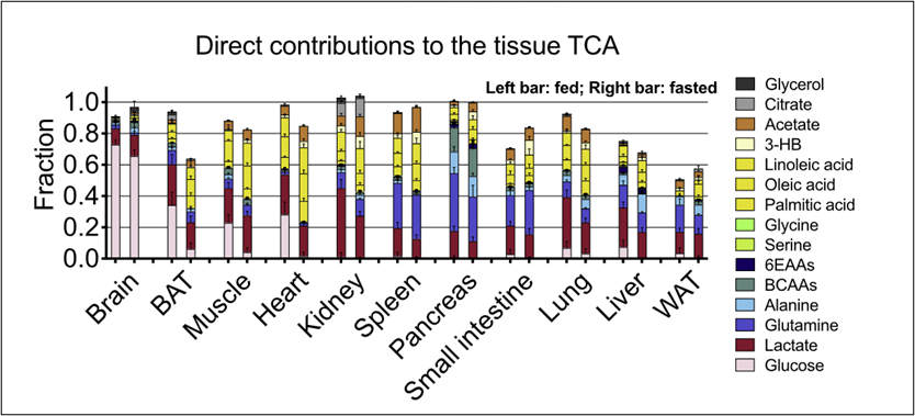 图6. [U-13C]-营养物作为示踪剂研究各营养物对于各个组织器官的三羧酸循环的代谢流计算结果。
