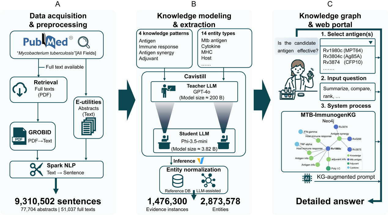 结核病(tuberculosis, TB)由结核分枝杆菌感染引起,至今仍是全球负担最重的传染病之一。具有百年历史的BCG疫苗虽能在一定程度上预防婴幼儿重症结核,但对成人肺结核的保护效力有限,攻克结核病仍依赖新一代疫苗的研发。在新疫苗的研发中,核心挑战在于从约4000个结核分枝杆菌蛋白中筛选出真正具有保护性的抗原。然而相关免疫学证据高度碎片化,分散在海量文献中,难以形成系统、可审计的证据基础。现有计算方法多依赖序列或结构特征,难以回答哪些抗原值得优先验证;直接依托大语言模型又面临事实准确性和可追溯性不足的限制。如何在保证可靠与可追溯的前提下,将分散文献证据整合为面向抗原优选的结构化知识体系,成为当前结核疫苗研发亟待解决的关键挑战。