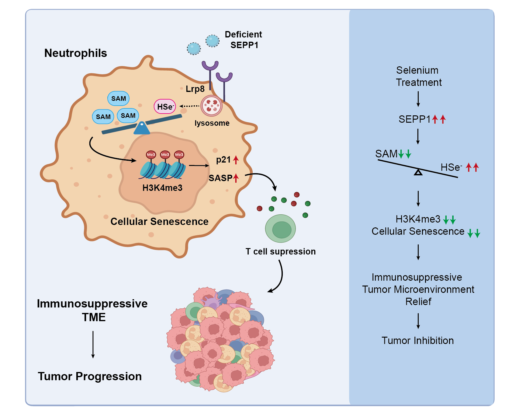 肝细胞癌(HCC)是全球范围内高发的恶性肿瘤,其复杂的免疫微环境是导致免疫治疗耐受的关键原因。近年研究显示中性粒细胞是肝癌微环境中重要的免疫细胞,具有高度的异质性和可塑性。尽管已有研究提示衰老样中性粒细胞具有免疫抑制功能,但其在肝癌中的分子特征及诱导机制尚不明确。流行病学研究也显示血清硒及SEPP1水平降低与肝癌风险增加密切相关,但其背后的生物学机制不明。