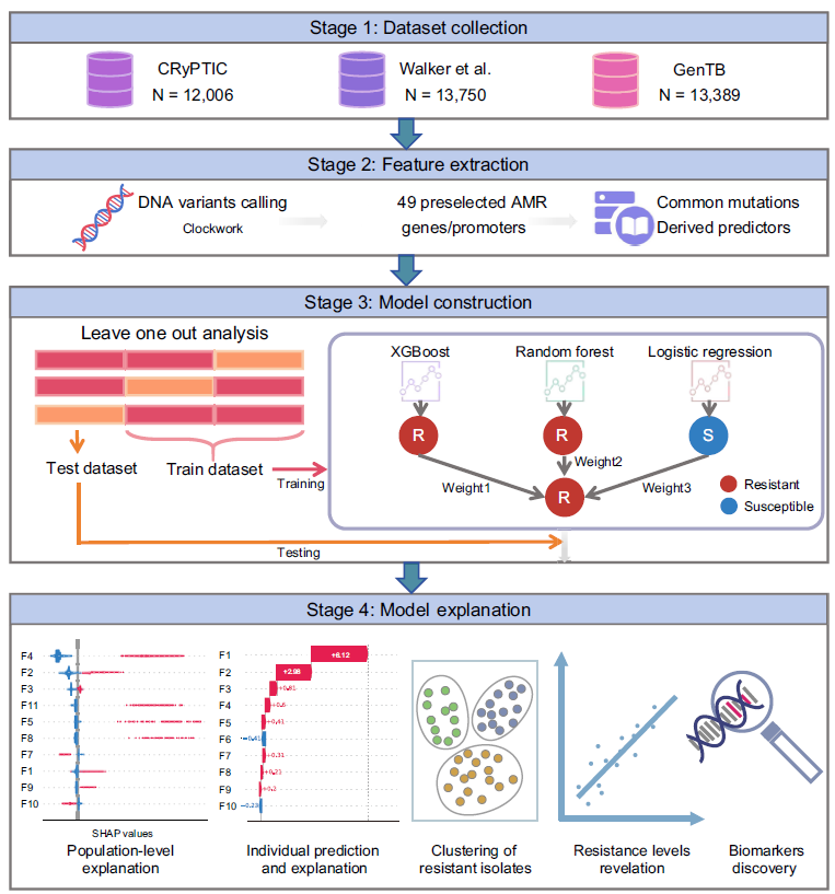 结核病是由结核分枝杆菌(Mycobacterium tuberculosis, MTB)引起的全球性细菌传染病,2023年全球约有1060万新发病例并导致130万人死亡。耐药结核病的出现显著降低了治疗成功率,进一步加剧了结核病防控的难度。近年来,机器学习方法已被用于从基因组数据中识别与耐药相关的复杂模式,但现有研究多停留在群体层面的统计关联,缺乏对单个菌株耐药机制的可解释性分析,而这一层面的解析对于理解特定突变如何介导耐药具有关键意义。因此,亟需能够同时提供群体层面“全局解释”和个体层面“局部解释”的预测模型:前者用于系统评估突变对耐药性的整体贡献,后者用于揭示具体菌株耐药表型的关键驱动因素。