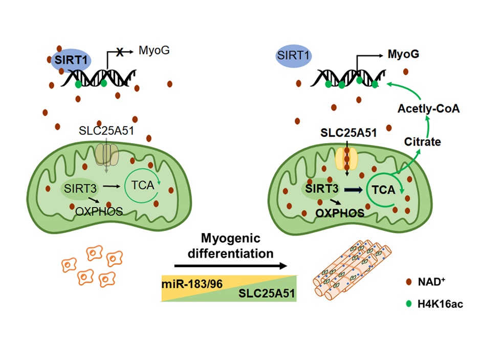 图:miR-183和miR-96通过调控NAD+亚细胞分布,进而调控骨骼肌干细胞分化和骨骼肌再生分子机制图